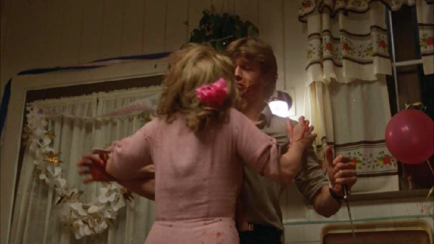 Probably my favorite character is the nose neighbor, Margie. She’s snappy, brass and always lurking around. She arrives with her husband to celebrate Billy’s birthday, but instead gets to sit awkwardly as all of this continues to go down. I should mention that when Margie walks in, Cheryl switches her gross, bloody grabbiness to her instead, ruining her dress. The cops arrive, and we get a classic good cop/bad cop. The latter berates them all, as he poo poo’s rape theories, and he tries to pin it on Billy. Then he starts to question Billy and Aunt Cheryl’s relationship, probably because as he stands there, Cheryl is wrapped around his arm like she wants to be ravaged by him.