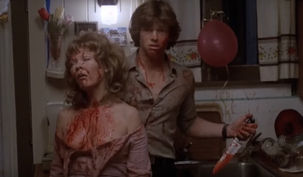 She slaps him for wanting to go to college, throws the food on the ground and then, like any true drama queen, goes upstairs to lay down. This movie is so damn dramatic, it could be a telenovela. It’s a “horrornovela.” And that means we need a good sexual assault scene. I’ll describe it for you. She throws herself at the repair man, and won’t take no for an answer. She “needs a man!” and so she unravels the top of her dress and literally throws herself onto him, begging him to have sex with her. He finally hits her out of self defense, so she one ups her rapey vibes and stabs him to death. Billy comes home to the tail end of this but it’s too late to save the man. “He tried to rape me” she says. Next up we watch her in hysterics, putting her bloody hands all over her nephew’s face and clothes for no reason. It’s hard to believe that this film isn’t self aware at this point.